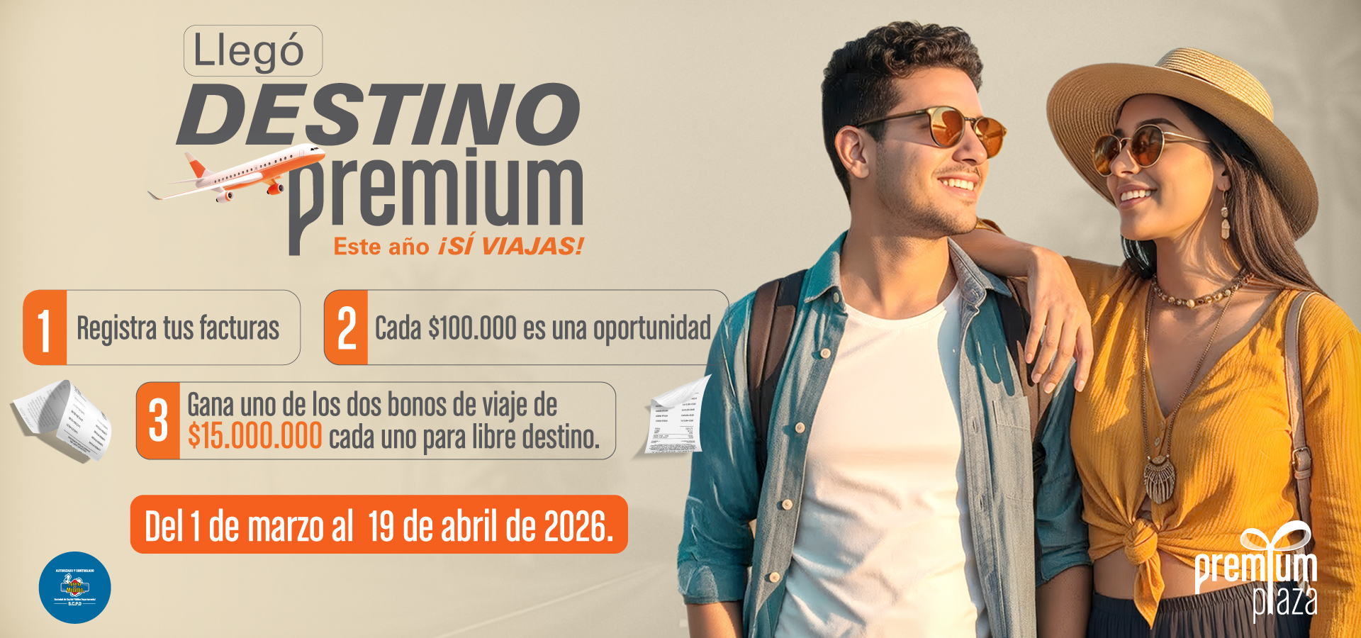 Si realizas compras acumuladas por $100.000 o más, en una o varias facturas de nuestras marcas del Centro Comercial Premium Plaza, entre el 1 de marzo de 2026 y el 19 de abril de 2026, podrás registrar tus facturas y entrar en el sorteo por uno de los dos bonos de $15.000.000 para un viaje donde prefieras.